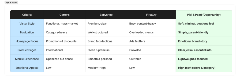I began by analyzing competitor websites and identifying design patterns that build trust with parents shopping for baby products.